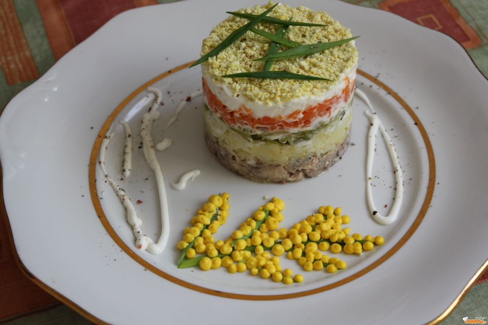 p.s:Слои моркови и картошки поменяла местами.Майонеза нужно совсем чуть-чуть,тоненьким слоем.Салатик получается легким и сочным!