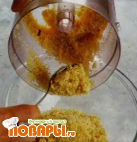 Измельчите миндаль, смешайте с 1 ст. л. сахара и мелко разотрите в миксере: в этом заключается основной секрет приготовления гладкого и пластичного марципана. Переложите в миску.