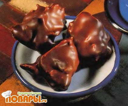 Окуните готовые «скалы» в растопленный шоколад для глазури, используя для этого вилку. Доставая «скалы» из шоколада, слегка постукивайте вилкой о край сосуда, чтобы стекли излишки. Выложите «скалы» на лист пергаментной бумаги и дайте застыть шоколаду.