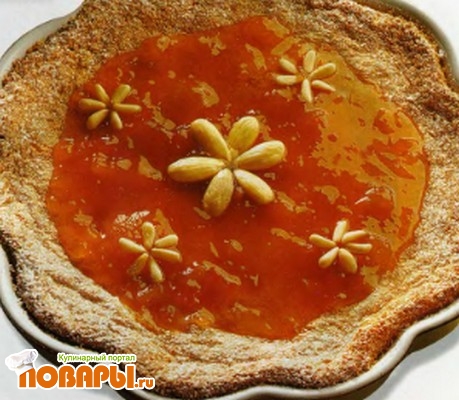 Выложите в кастрюльку варенье и нагревайте на слабом огне, пока оно не станет жидким. Намажьте вареньем поверхности коржа, не доходя 3 см до краев, которые посыпьте сахарной пудрой, пропуская ее через ситечко. Украсьте торт миндальными и кедровыми орехами, выкладывая их в виде цветов.