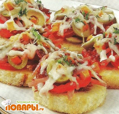 Разложите на ломтики хлеба помидоры, ветчину, колбасу, перец и оливки, нарезанные кружочками. Сверху посыпьте молотым перцем, нанесите полосками майонез и посыпьте сыром.