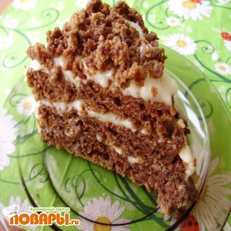 Корж делим на 3 «уголка», промазываем кремом каждый уголок, а сверху посыпаем остатками от коржей, крошками.