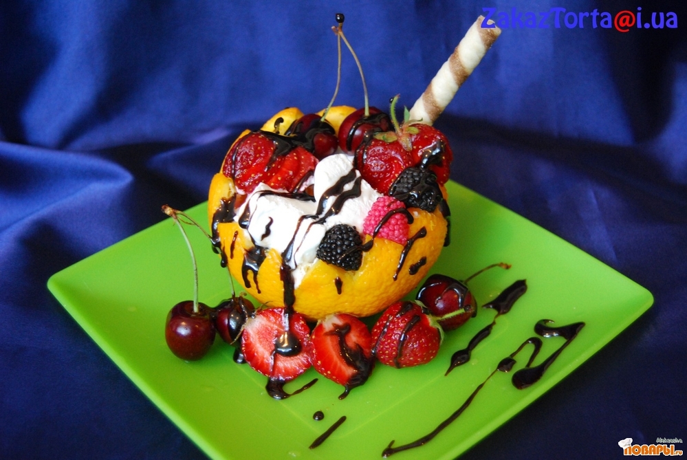 Разрезаем апельсин пополам или фигурно как у меня на фото, вынимаем все изнутри, кладём мороженое порезанное на кусочки, добавляем ягодки, вернее раскладываем их красиво. Топим на водяной бане шоколад и поливаем наш десерт.
