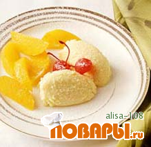 Форму застелить пленкой, положить массу и разровнять. Форму накрыть пергаментом и поставить на 2-3 часа в морозилку. Готовое мороженое вынуть из формы, нарезать, подавать с фруктами.