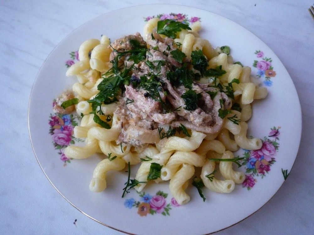 Подавать с макаронами, сверху посыпать зеленью.