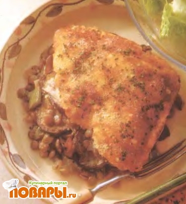 Половину жареных баклажанов положить на дно широкого огнеупорного блюда для запекания. Сверху равномерно выложить чечевичную смесь, затем еще один слой баклажанов. На время отставить.