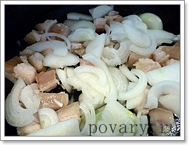 Как только сало подрумянится, кладем на обжарку лук (порезанный полукольцами).