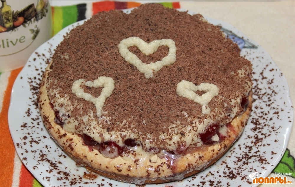Взбить сливки с сахаром. Добавить маскарпоне, все хорошо перемешать. Далее выкладываем кем на вишню, сверху натираем шоколад на терке. Оставляем пирог для пропитки в холодильнике на 3-4 часа.