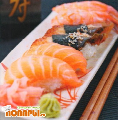 На каждый шарик риса выложить по ломтику лосося, угря или креветки, смазанной васаби стороной вниз.