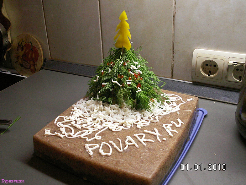 Это блюдо у нас считается строго новогодним, потому что делается только раз в году. На главной фотке украшение из укропа, нанизанного на шпажку, а для стола я несколько изменила украшение. В целях экономии места (холодец занимает значительную часть стола) я выложила на него горкой плотные салаты (оливье и крабовый) и замаскировала их под елочки. Елочки получились более толстенькие, зато эффект от компановки превзошел все ожидания! На фотке только один салат, вторая елочка была поставлена на надпись "повары.ру"))), больше места не нашлось.