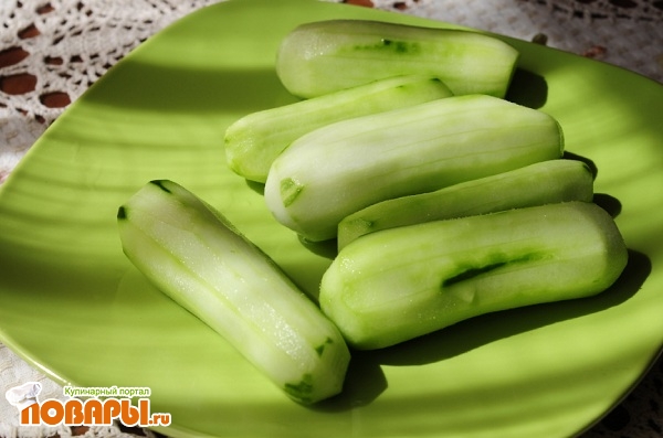 Подготовленные огурчики нужно порезать соломкой шириной 1см. и длиной приблизительно 5 см. Порезали, значит выполнили самую трудную работу.