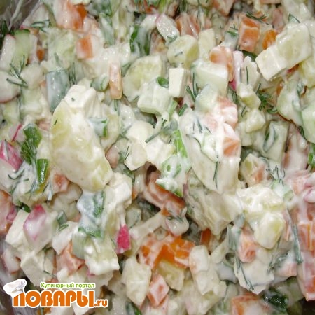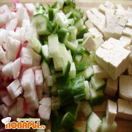 Пока готовятся морковь и картофель (кстати, в пароварке удобнее, не надо следить), нарезаем зелень, редис и огурец. Кто-то их трет, но одинаковые кубики (особенно мелкие) смотрятся лучше.