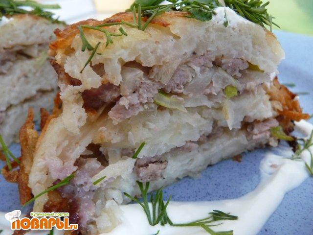 Готовые оладьи переложить свиным фаршем и поставить в духовку на 15 - 20 мин.