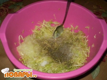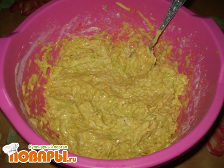 Добавить муки и замесить тесто. Тесто должно быть не густым, но если сильно жидкое, так как кабачки пускают сок, то можно еще муки чуть больше добавить, или же просто слить сок с кабачков.