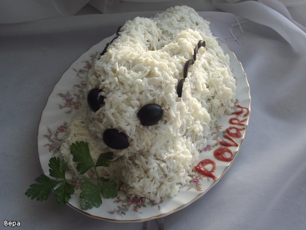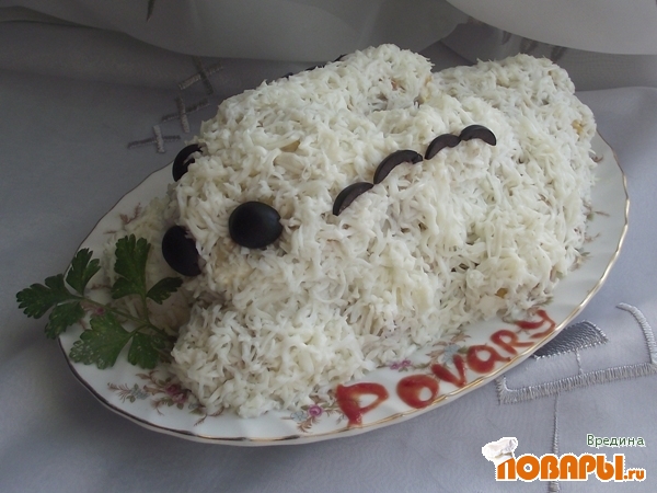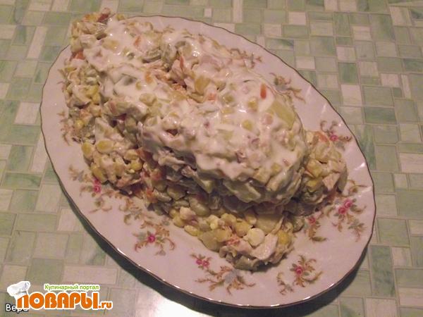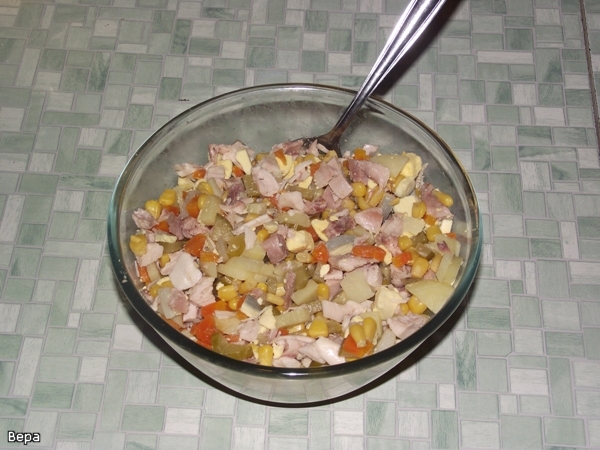 Окорочок отварить, очистить от кожи и костей.Мясо нарезать кубиками.