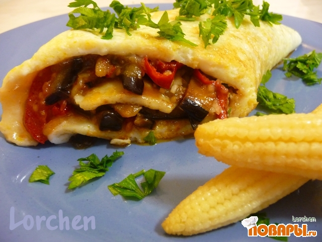 Когда омлет будет готов, сверху выложить овощную начинку и посыпать мелко порезанным чесноком, завернуть.