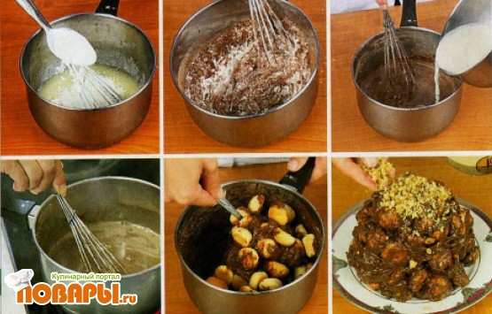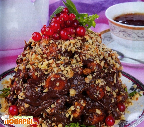 Затем осторожно перемешать печеные орешки с кремом, выложить на смазанное сливочным маслом блюдо, придать форму горки. Сверху торт посыпать измельченными грецкими орехами или тертым шоколадом. Поставить в холодильник на 8-10 часов.