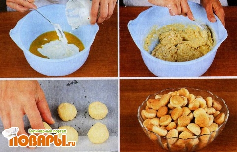 Все ингредиенты смешать. Из получившегося теста отщипывать кусочки и скатывать в «орешки», т.к. тесто получается мягкое.