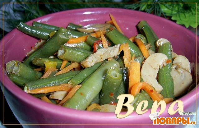 Фасоль отварить в кипящей воде 2-3 минуты, слить воду.