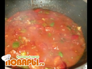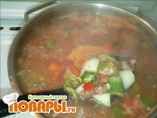 На вытопленном жиру обжариваем лук и чеснок, а шкварки нам не понадобятся. Кто любит, может добавить в суп. Добавляем к луку красный и зелёный перцы. Как только перец подрумянится, добавляем консервированные помидоры вместе с томатом, если они целые, то нужно предварительно их порезать, убрать кожицу.
