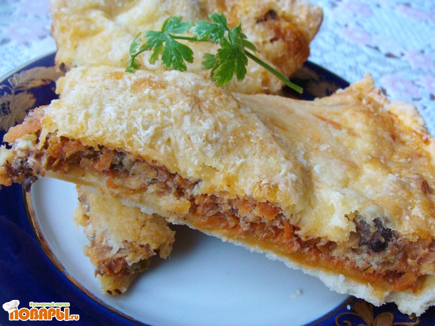 Приготовить начинку. Натереть на крупной терке морковь, нарезать кубиками лук, притушить на растительном масле пару минут, добавить томатную пасту, соль, перец и хмели-сунели. Рыбную консерву слегка размять вилкой, смешать с тушеными овощами. Смесь выложить в форму, на раскатанное тесто.