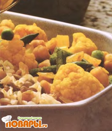 Цветная капуста, отборные зеленые стручки фасоли и горошек запекаются с рисом и чечевицей в пряном кокосовом соусе.