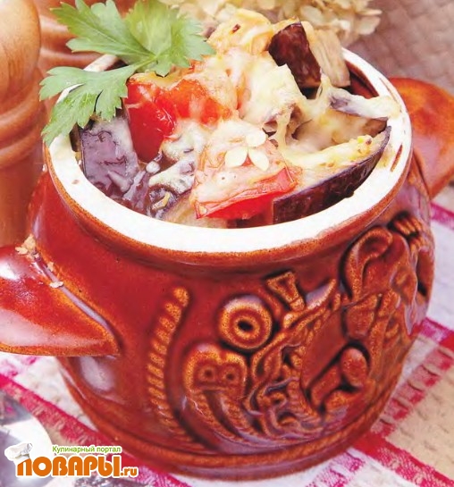 Овощи слоями положить в горшочки, пересыпая мелко нарубленной зеленью петрушки, толченым чесноком, перцем и солью.