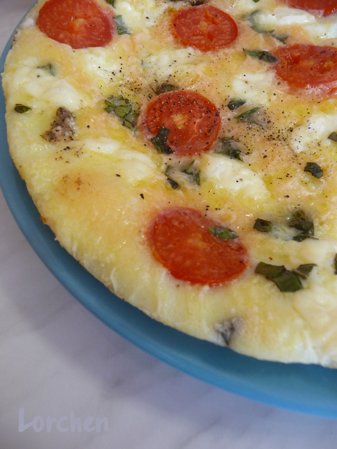 На сковородку вылейте яйца. Пламя должно быть меньше среднего. Когда верх омлета перестанет чуть-чуть быть жидким и «схватится», хаотично выкладываем кусочки брынзы, кружки помидоров, мелко порванный базилик и жарим до готовности. Посыпать перцем.
