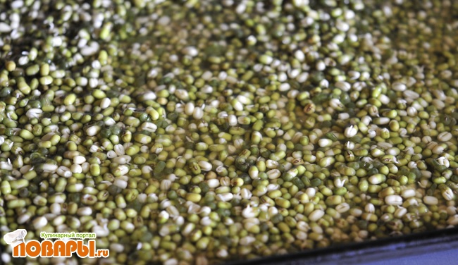 Коротко расскажу о том, как подготовить маш, т.е. как его простить. Промойте маш, выложите его на плоской поверхности, возможно использовать марлю. Залейте водой, можно покрыть марлей. Маш прорастает в течение 3-4 дней и на протяжение всех дней нужно подливать воду. Проросший маш выложите на сито и промойте под большим напором воды, таким образом шкурка отойдет.