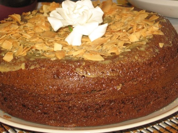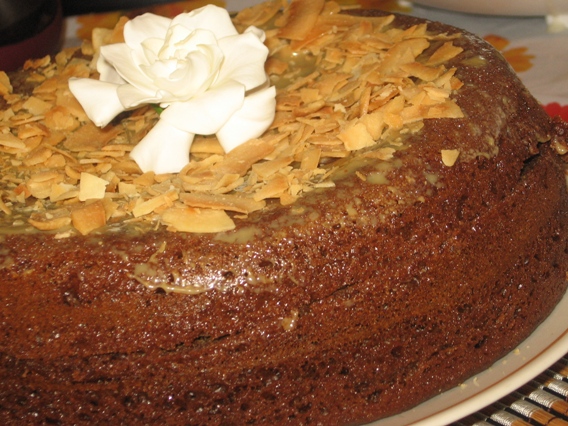 Сверху чем-нибудь украшаем. Я украсила цветком гардении, как раз распустился и миндальной стружкой.