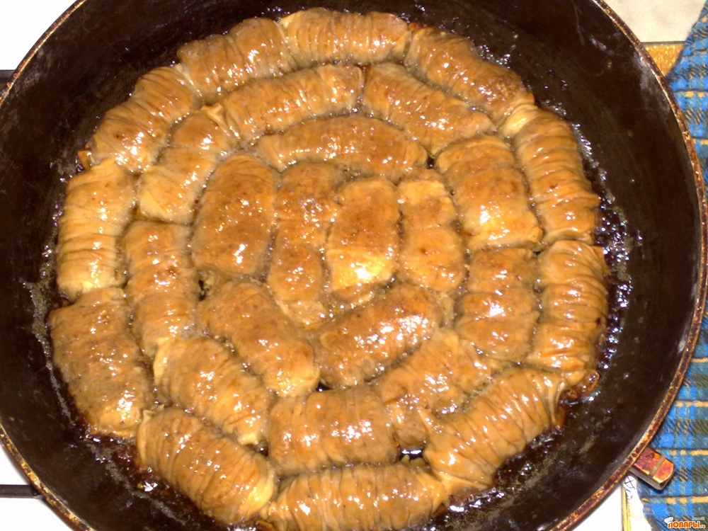 Собрать тесто с двух сторон в гармошку,снять с палочки и уложить в смазанную форму. Смазать сверху яйцом и печь в разогретой духовке.Через 15-20 минут полить сверху подогретым топленым маслом.Как зарумянятся полить горячим сиропом и выпекать до готовности.