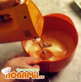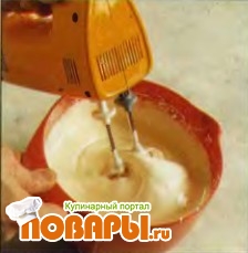 Взбивайте по крайней мере 15 минут пока крем не увеличится в объеме и не станет белым, как показано на фото.