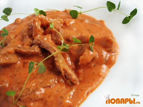 Добавить паприку и соль. В самом конце влить сметану, и мелко рубленный укроп. Переложить кусочки мяса.