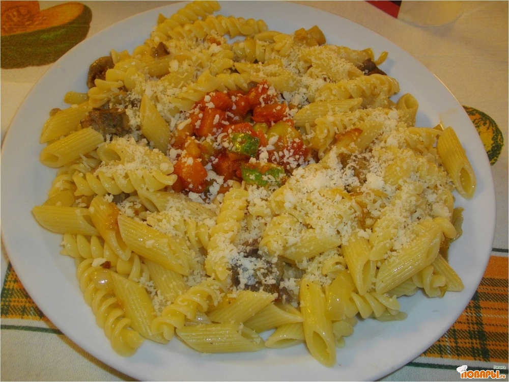 150-200 макаронных изделий из твердых сортов пшеницы «Фузили» (спиральки) или «Пенне» (перья), 100 г. мякоти тыквы, 1 цуккини, 2 зубчика чеснока, 1 веточка розмарина, 2 ст.л. томатного пюре (пасты), 150 г. свежих или замороженных маслят, 1 луковица, пару ложек тертого пармезана, 2-3 ложки оливкового масла, душистый перчик,соль.
