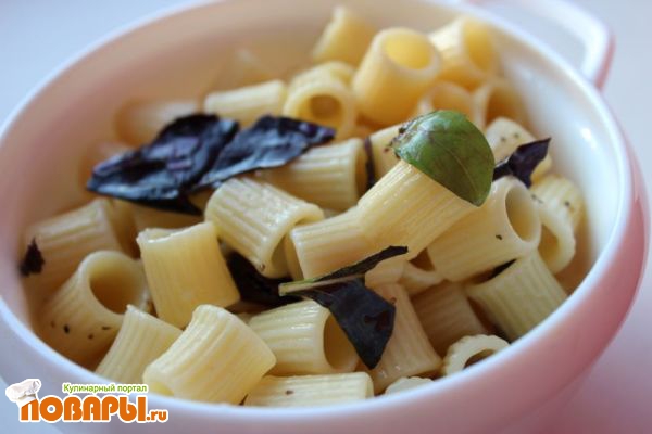 Сливаем пасту, заправляем оливковым маслом, солью, перцем крупного помола, посыпаем базиликом и перемешиваем.