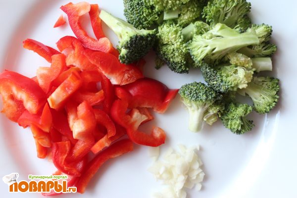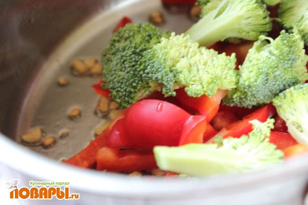 Наливаем в сотейник масло растительное. Разогреваем. Опускаем чеснок (режу очень мелко), затем перец и свежую брокколи (и то и другое я нарезала некрупно), подсаливаем овощи, немного прожариваем, добавляем чуть-чуть воды и закрываем крышкой.