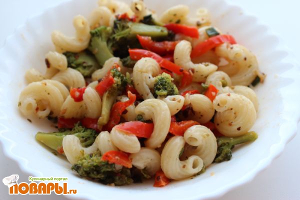 Смешиваем пасту с тушеными овощами и прогреваем минуту-две.