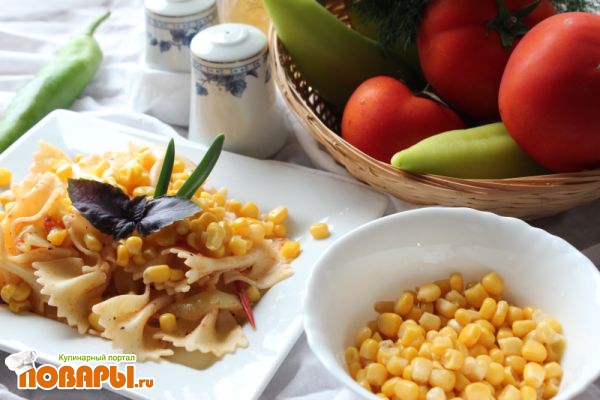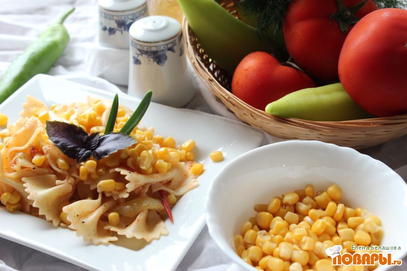 Когда паста готова и откинута, можно добавить в соус сладкую кукурузу (даже чуть-чуть жидкости от нее, особенно если макароны не доварили), прогреть кукурузу, потом добавить пасту и также прогреть. Если паста была недоварена, то и протушить несколько минут.