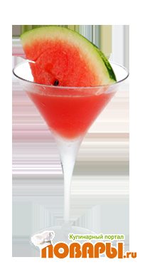 Помни пестиком и налей: водку 40 мл, арбузный сироп 10 мл, сахарный сироп 10 мл