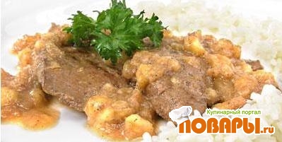 Печень вынимаем из маринада, обсушиваем и обжариваем в растительном масле, после чего кипятим в процеженном маринаде около 3-4 минут. Добавляем в соус растертый банан и без промедления подаем блюдо к столу. На гарнир рекомендуем рассыпчатый рис.