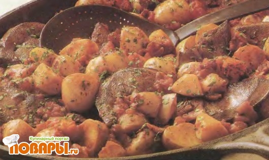 Положить в сковородку картофель, перемешать, выложить печень, прикрыть крышкой и тушить 3-4 минуты. Приправить паприкой, посыпать зеленью петрушки и подать на стол с хрустящим черным или белым хлебом.