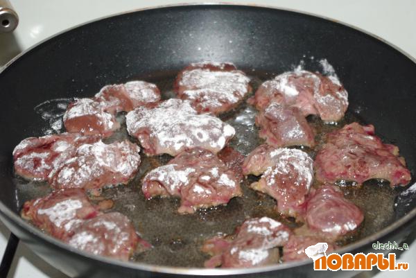 Печень необходимо очистить от жилок, нарезать, немного отбить. Обмакнуть в муку и обжарить. Солить нужно, когда перевернем на другую сторону.