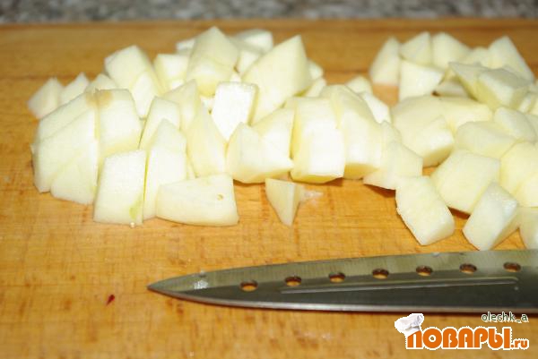 Яблоки нарезаем кубиками и обжариваем на той же сковороде, на которой жарили печень (масло лучше после печени процедить).