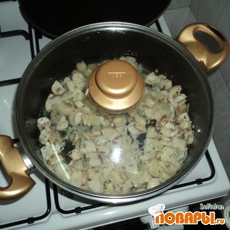В кастрюлю с растительным маслом выложить лук и чеснок, обжаривать до мягкости лука. Затем добавить шампиньоны, потушить под крышкой 10 минут. Если в кастрюле образуется много воды, то можно снять крышку, пока лишняя вода не испарится.