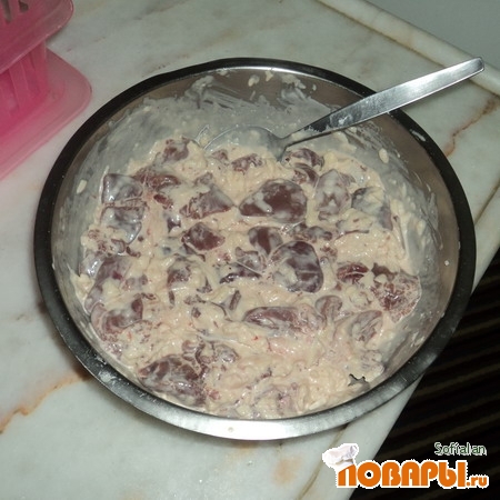 Сыр натереть на крупной терке. Смешать печень, порезанную на кусочки, с сыром и майонезом, посолить.