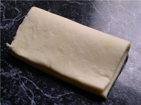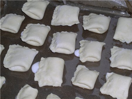 Тесто раскатать в пласт, разрезать на прямоугольники или вырезать кружочка. На каждый прямоугольник положить начинку, свернуть пополам, защепить по краям, свернуть еще раз пополам, защепить края и выложить на смазанный противень.