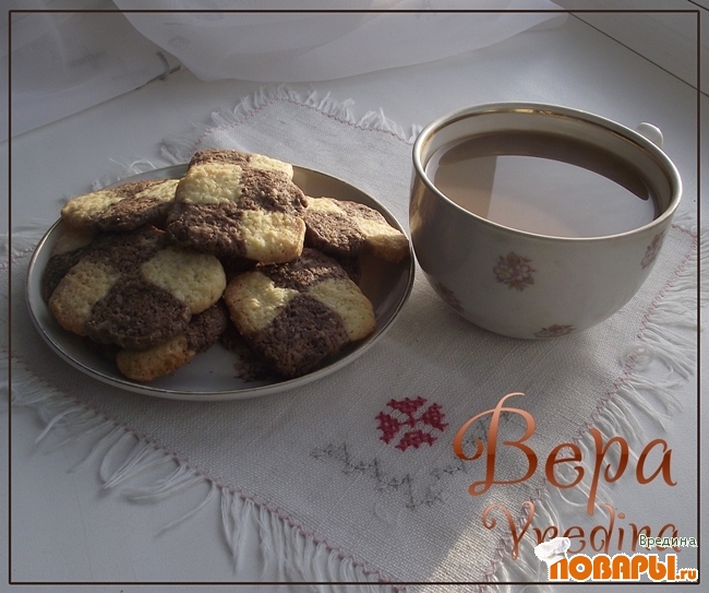 Тесто разделить на 2 части, в одну добавить ванилин, в другую какао.