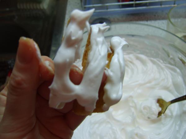 Приготовление крема. Взбить охлажденные белки (без сахара) до устойчивых пиков. Поставить миску на паровую баню, продолжая взбивать, всыпать в три приема сахар. Прогревать и взбивать 5-7 мин. В конце добавить лимонную кислоту. Готовый крем охладить.