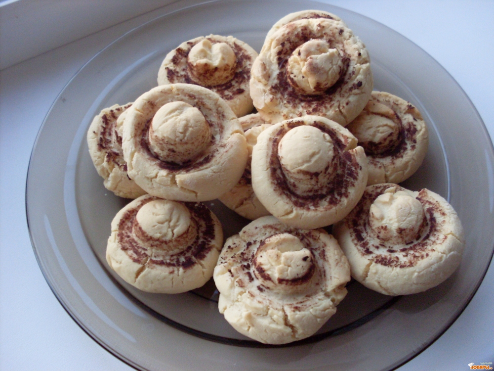 Горлышко пластиковой бутылки слегка макаем в какао, затем шарик теста берем и надеваем на горлышко бутылки, давим слегка тесто, чтобы часть оказалась в бутылке, прокручиваем один раз и формируем грибочек.