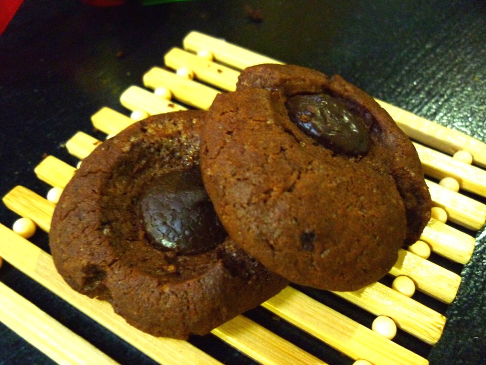 Ложкой брать кусочки теста и сформировать шарики величиной с грецкий орех. Выложить их на противень соблюдая среднее растояние - где-то 5 см. между печеньками. Наперстком или торцом деревянной ложки сделать углубления в шариках, в каждое углубление положить кусочек шоколада.